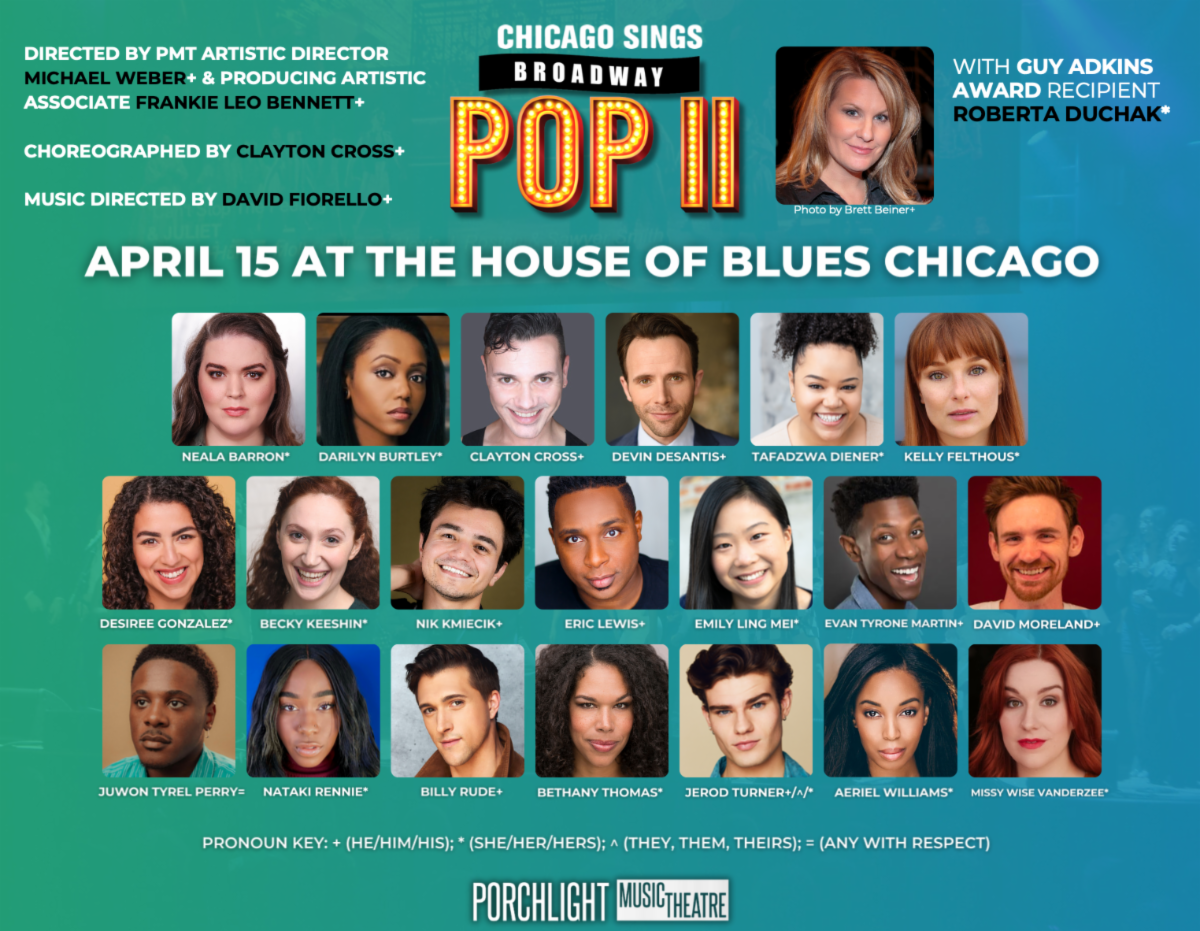 Porchlight Music Theatre is proud to announce the cast for Chicago Sings Broadway Pop II, its annual fundraising concert, Monday, April 15, at the House of Blues Chicago, 329 N Dearborn St, co-directed by Porchlight’s Artistic Director Michael Weber and Producing Artistic Associate Frankie Leo Bennett, choreographed by Clayton Cross with David Fiorello as music director. This concert, with a new program of music, includes live performances by Chicago music theatre’s best loved artists, the presentation of the 2024 Guy Adkins Award for Excellence in the Advancement of Music Theatre in Chicago to Roberta Duchak by last year’s recipient Rick Boynton and more.