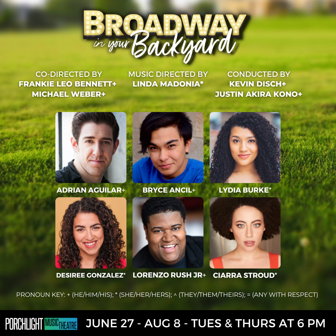 Porchlight Music Theatre is proud to announce the 2023 company for its free summer concert series Broadway in your Backyard starring Broadway veterans and recent Porchlight “New Faces,” now in its third year, June 27 - August 8, as part of Chicago Park District’s Night Out in the Parks series, supported by the Mayor’s Office and Chicago Department of Cultural Affairs and Special Events and Comcast and Xfinity. The rotating company includes performers Adrian Aguilar+, Bryce Ancil+, Lydia Burke*, Desiree Gonzalez*, Lorenzo Rush Jr+ and Ciarra Stroud* with conductors/pianists Kevin Disch+ and Justin Akira Kono+. Broadway in your Backyard is co-directed by Frankie Leo Bennett+ and Michael Weber+ and music directed by Linda Madonia*. For more information go to PorchlightMusicTheatre.org.