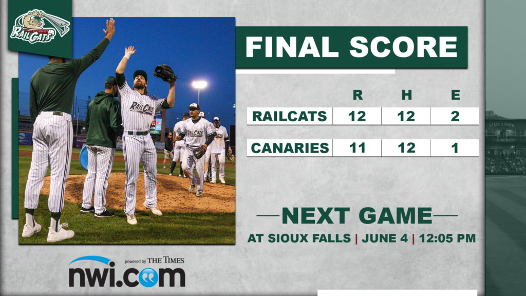 Sioux Falls, SD – Though they trailed by at least three runs on two separate occasions, the Gary SouthShore RailCats (11-10) refused to give up. A pair of furious comebacks helped them snatch victory from the jaws of defeat as they took down the Sioux Falls Canaries (8-13) 11-10.