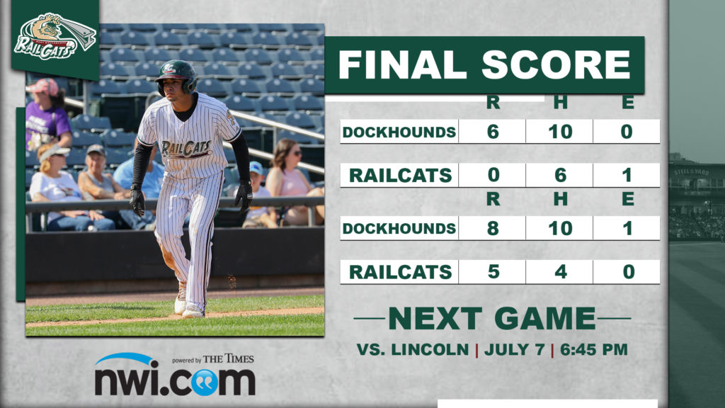 Despite scoring five of the last six runs, the Gary SouthShore RailCats (20-30) fell short 8-5 in Game 2 after dropping Game 1 6-0 to the Lake Country DockHounds (21-27) in a Fourth of July doubleheader at The Steel Yard.