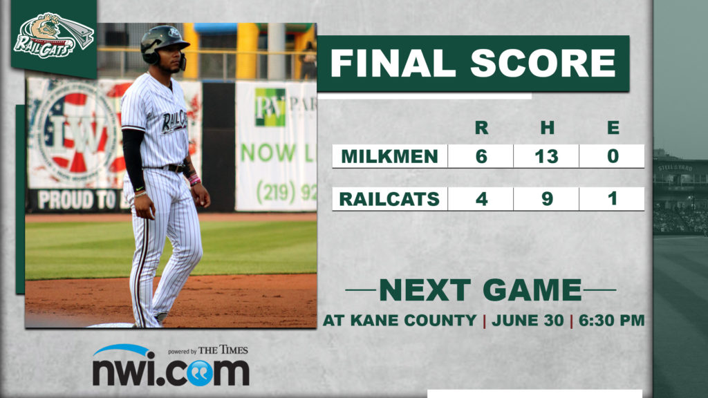 Three ninth innings runs just were not enough for the Gary SouthShore RailCats (18-26) as a late comeback bid came up just short against the Milwaukee Milkmen (25-17) as they dropped the series finale 6-4 Thursday night at The Steel Yard.