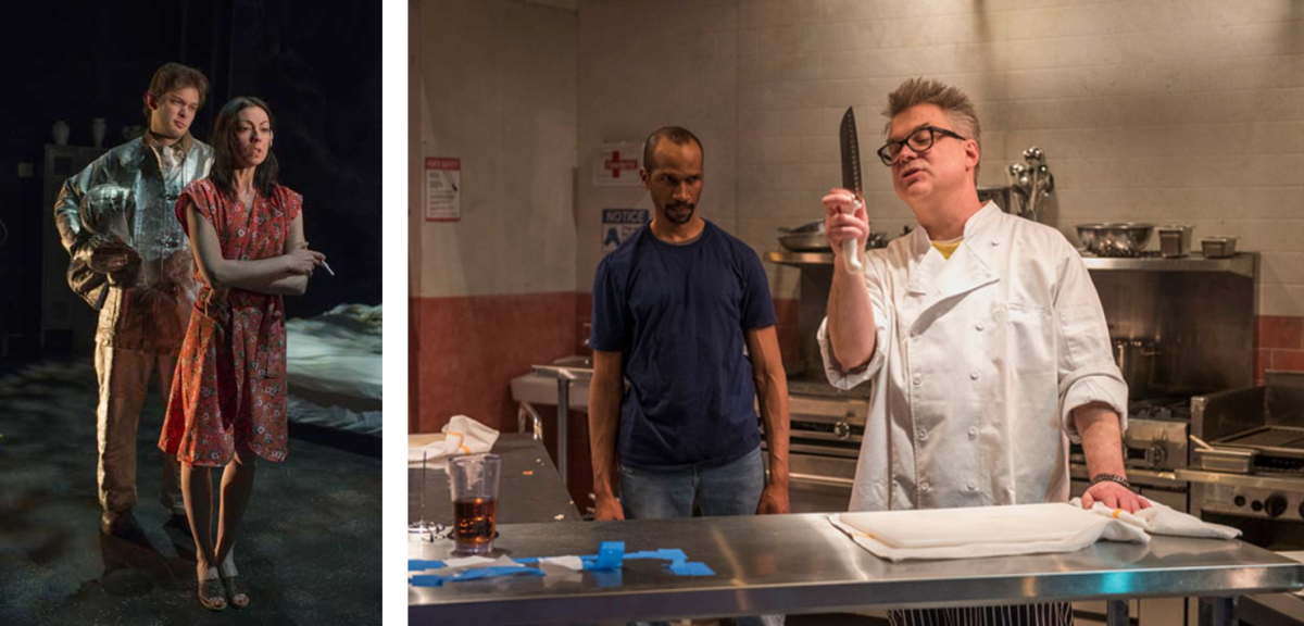 (left) Kate LoConti (foreground) and Drew Schad in Shattered Globe’s 2014 production of Sally Nemeth’s Mill Fire, directed by Sandy Shinner. (right) Anthony Irons (left) and Peter DeFaria in Shattered Globe’s 2018 production of How to Use a Knife by Will Snider, directed by Sandy Shinner. Credit: Michael Brosilow
