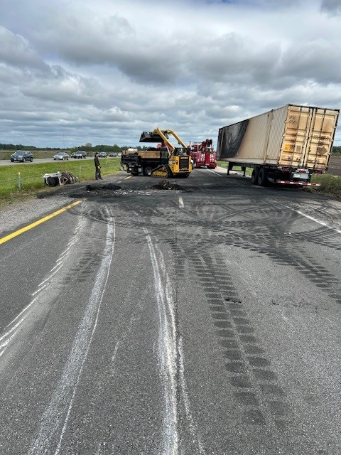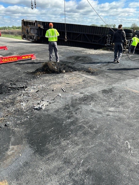 Due to the intense nature of the fire, the asphalt was damaged and was deemed not safe for traffic. INDOT contacted Rieth Riley to make repairs to the roadway, removing the damaged asphalt and replacing it with new. The roadway was reopened at approximately 5:30 p.m.