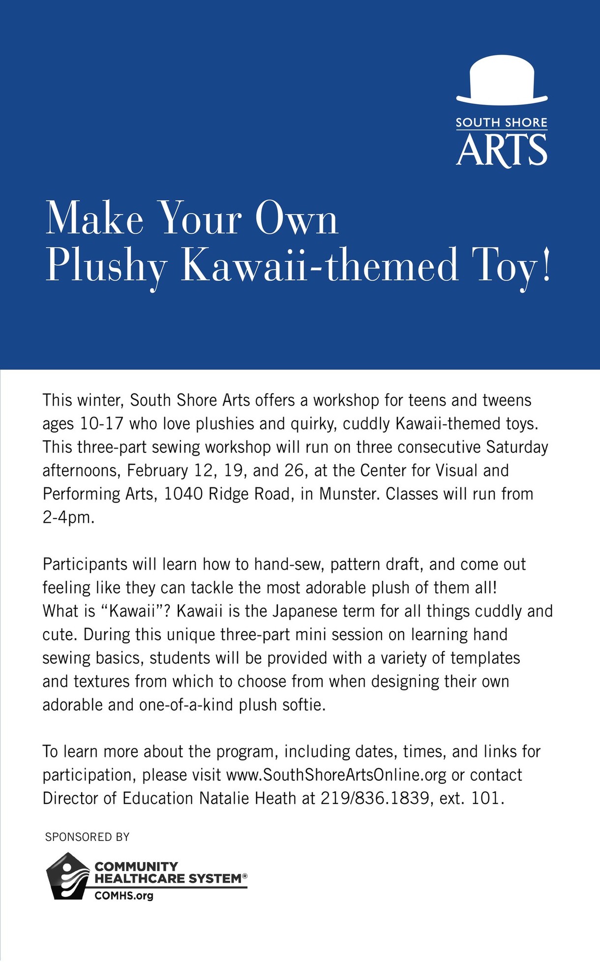 This winter, South Shore Arts offers a workshop for teens ad tweens ages 10-17 who love plushies and quirky, cuddly Kawaii-themed toys. This three-part sewing workshop will run on three consecutive Saturday afternoons, February 12, 19, and 26, at the Center for Visual and Performing Arts, 1040 Ridge Road, in Munster. Classes will run from 2-4pm.