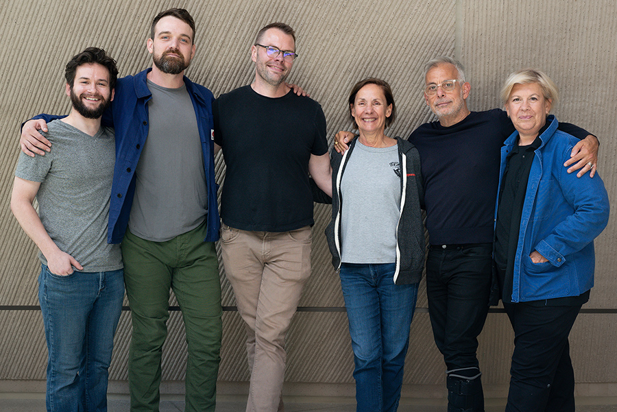 The cast and creative team of Steppenwolf Theatre’s world premiere of Little Bear Ridge Road includes (left to right) John Drea, Micah Stock, Playwright Samuel D. Hunter, ensemble member Laurie Metcalf, Director Joe Mantello and Meighan Gerachis. Photo by Joel Moorman.
