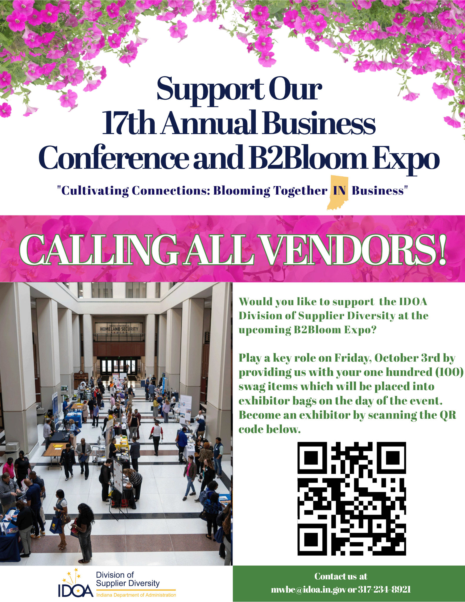 Would you like to support the IDOA Division of Supplier Diversity’s 17th Annual Business Conference and B2Bloom Expo while promoting your business? Then, sign up today to become an exhibitor at the B2Bloom Expo and provide us with one hundred (100) in-kind promotional items that represent your business. Scan the QR code on the flyer or use the following link to sign up at https://tinyurl.com/3tfdfc5v