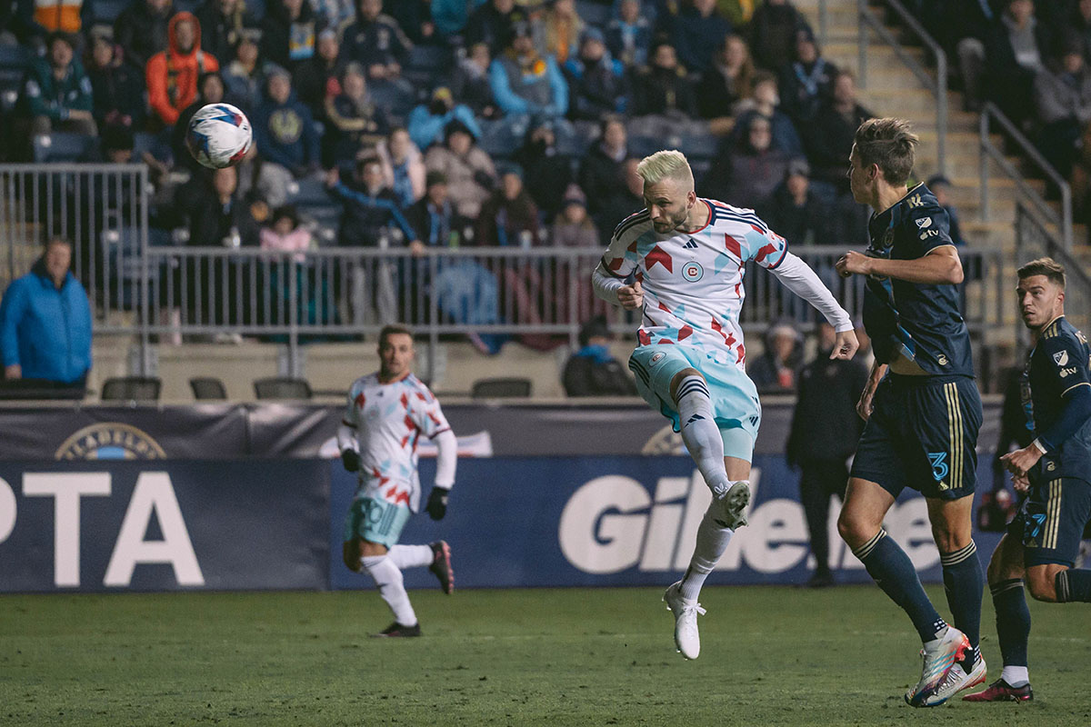 It was a back-and-forth affair in the first half with Philadelphia earning a free kick, followed by a corner kick in the 13th minute. Defender Kai Wagner sent in a corner that forward Julian Carranza fired on goal, but Chicago midfielder Gastón Giménez was on the goal line to clear the shot away from danger.