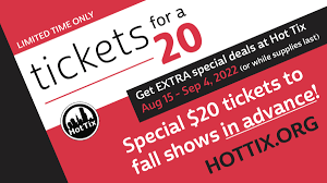 Hot Tix is bringing back its special, limited-time only promotion offering $20 tickets to fall productions in advance. These special, limited-time $20 prices will only be available Monday, August 15 – Sunday, September 4, or while supplies last. In addition to the $20 ticket offers, Hot Tix has many half-price shows that are less than $20. Additional information is available at https://hottix.org/special-offer-tickets-for-a-20/.