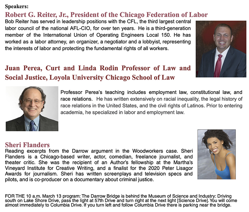 Later that day, a special free program will be held to discuss the Woodworkers’ case, with a reading of excerpts from Darrow’s closing argument. That program is Monday, March 13, 6–7 p.m.; doors open 5:30 p.m., at Loyola University Chicago Quinlan School of Business, 16 E. Pearson, Room 1001. The evening program is co-sponsored with the Civitas ChildLaw Center and Curt and Linda Rodin Center for Social Justice at Loyola University Chicago School of Law.