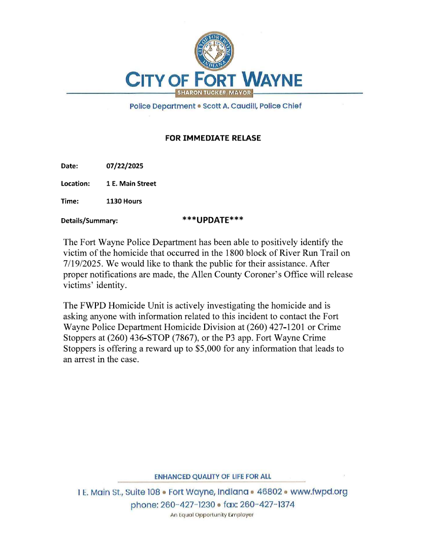 The Fort Wayne Police Department would like to update the release from July 21, 2025 with the following statement regarding yesterday's request for assistance in identifying a homicide victim.