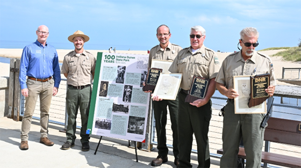 In September, Indiana Dunes State Park celebrated its 100th anniversary. The park unveiled a new interpretive centennial sign sponsored by the Friends of Indiana Dunes that showcases the history of the park’s beginnings. They also recognized long-time staff members Doug Sutherland (40 years), Steven Brooks (30 years), and Michael Buchiet (30 years), who combined have 100 years of service.