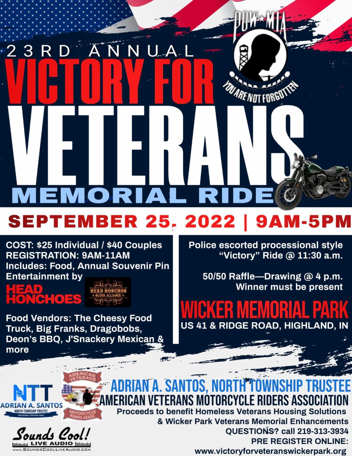 The 23rd Annual Victory for Veterans Memorial Ride, co-hosted by the American Veterans Motorcycle Riders Association and Adrian A. Santos, North Township Trustee, will be held Sunday, September 25th from 9:00 am -5:00 pm at Wicker Memorial Park in Highland, IN. $25 Individual, $40 Couples.
