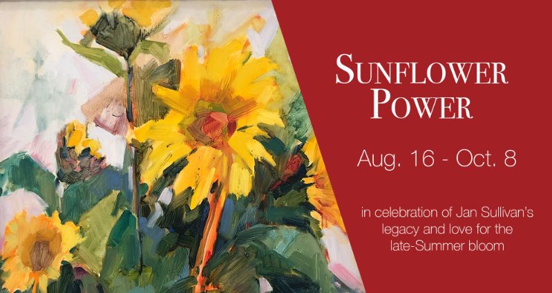 As part of Art Blitz and in honor of Jan Sullivan’s love of the late-Summer bloom, Art Barn is hosting “Sunflower Power” which began August 16 and will hang through October 8. The exhibition features thirty 2-dimensional works, mostly paintings, which depict sunflowers including eight works by Jan Sullivan as well as the work of a dozen other local artists including John Bernbom, Kris Cook, Jean Head, Dina Heijselaar, Julia Holmaas, Frances R. Johnson, Dianne Maxey, Russell Nelson, Lesley Rich, Janet Smedley, (attributed to) Ann Templeton, and Gail Woolever.