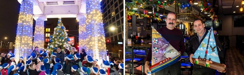 Greektown Chicago 2024 tree lighting, photo credit Elios Photography. Greektown karavákia display at Spectrum Bar & Grill by artists Kiki Whitehead and Louis DeMarco, photo credit Heidi Zeiger Photography.