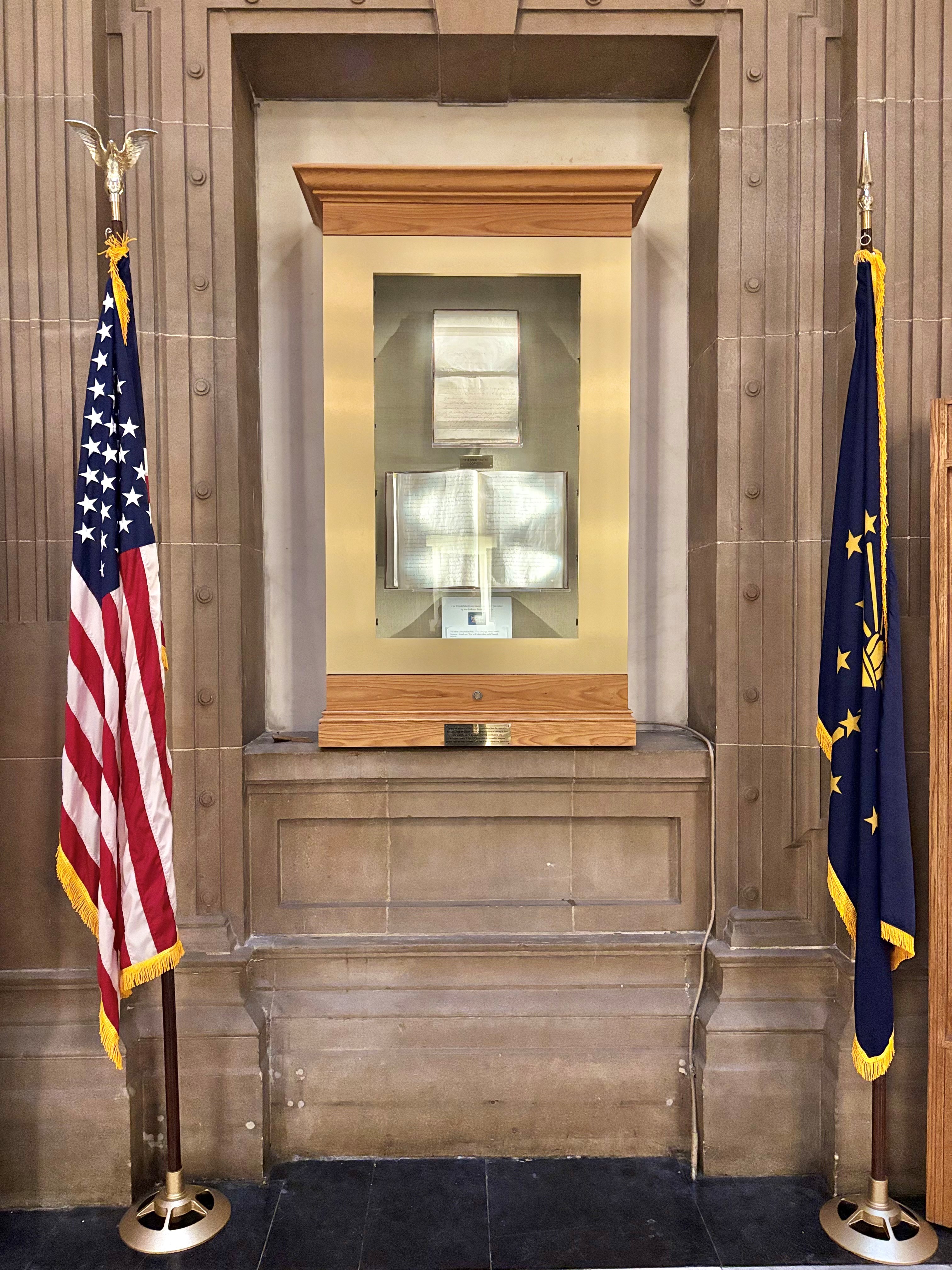 January 19, 2000 A new display case for the Indiana Constitutions is dedicated in the Statehouse Rotunda. Officials include Governor Frank O’Bannon, Chief Justice Randall Shepard, and Senator James Merritt.