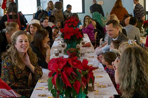 After the stories, families are invited on stage to explore the trunks, pull the levers and turn the cranks that reveal magical 3D images. After photos with the cast, families come together in a Victorian-style dining hall to enjoy a festive spread of cookies, chocolate milk, coloring activities and beautiful holiday decor.