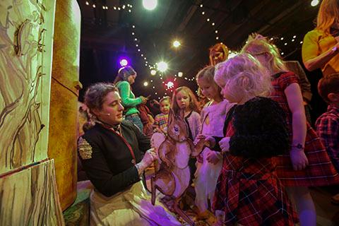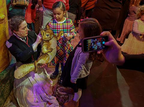 (left) Kay Kron, in the 2018 outing of The Beatrix Potter Holiday Tea Party inviting kids on stage to meet puppets, pull levers and turn cranks that produce moments of delight. (right) After photos with the cast, families head to Chicago Children's Theatre's lobby to enjoy cookies and chocolate milk in a tea party setting. Photos by Charles Osgood.