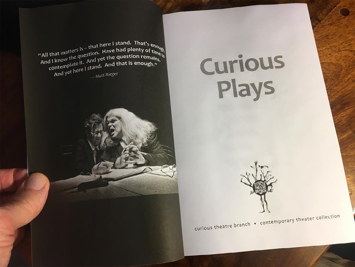 This handsome thick paperback contains eight works of the imagination by Curious playwrights Jayita Bhattacharya, Bryn Magnus, Jenny Magnus, Beau O’Reilly, Shawn Reddy, Matt Rieger, Matt Test and Julia Williams. It also holds production photos and profiles and a wonderful introductory abecedarium by Barrie Cole. Books are now available online at Jackleg Press, bookshop.org and amazon.com. (512 pages, paperback, ISBN 978-1-956907-02-5).