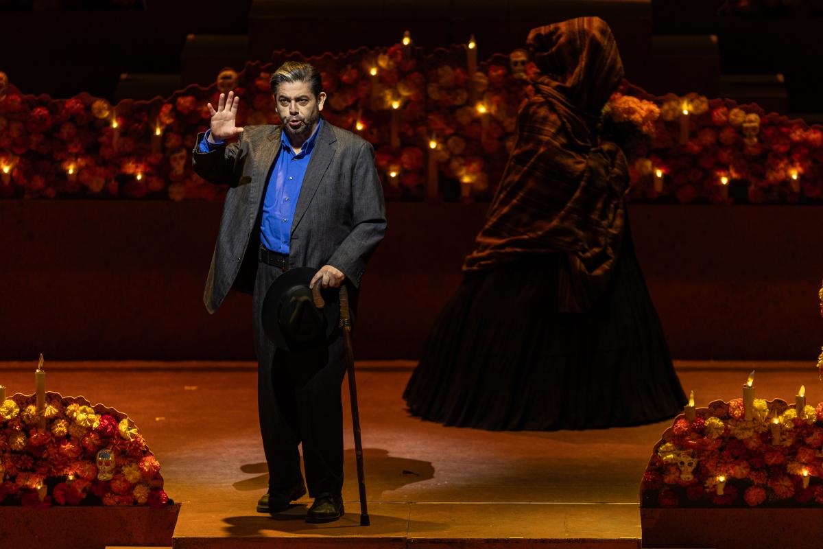 For the second time in just as many months, Grammy Award-winning soprano Ana Maria Martinez effortlessly steals the show once again at Lyric Opera of Chicago. If you were fortunate to have seen her Despina in Mozart's "Cosi fan tutte" earlier this season, you have an idea of what you are in store for here. Martinez once again gets to be decked out in the production's flashiest costumes (same as in "Cosi") and she has such strong instincts as an actor that it's nearly impossible to take your eyes off of her any time that she is on the stage. Martinez sings the role of Catrina, Keeper of the Dead, and finds humor in the drollest of macabre moments. It's a physically and vocally challenging role, but Martinez brings it off with aplomb. Martinez imbues her Catrina with quirky movements and constant gestures as the character is always in motion. Under Martinez's skilled training, it all looks and feels 100% authentic.