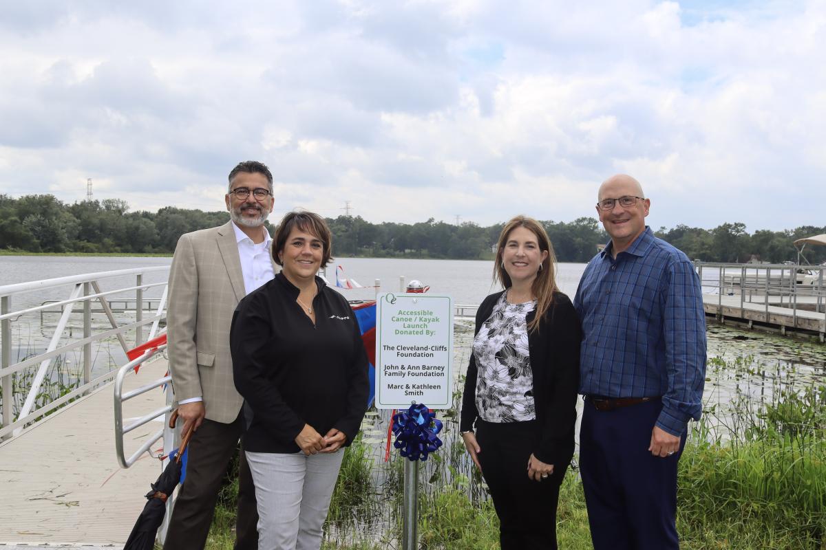 From Left to Right: Neil Samahon, President and CEO of OE joins Raeann Trakas representing Cleveland-Cliffs Foundation, and donors Marc and Kathleen Smith who are also representing the John and Ann Barney Foundation standing near the new sign thanking funders for the new accessible kayak launch.