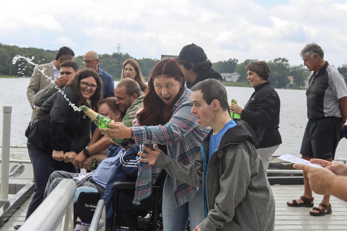 Staff, individuals served by OE, and launch funders end the launch ceremony with the tradition of dedicating the water access with sparking juice sprayed into the water for good luck and safe travels for users of the launch.