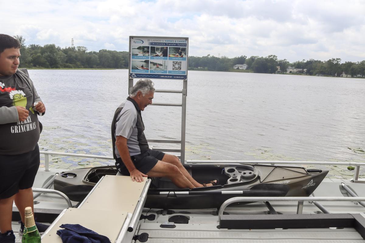Volunteer Dennis Harrington demonstrates to the crowd how the launch can be used to access the water.
