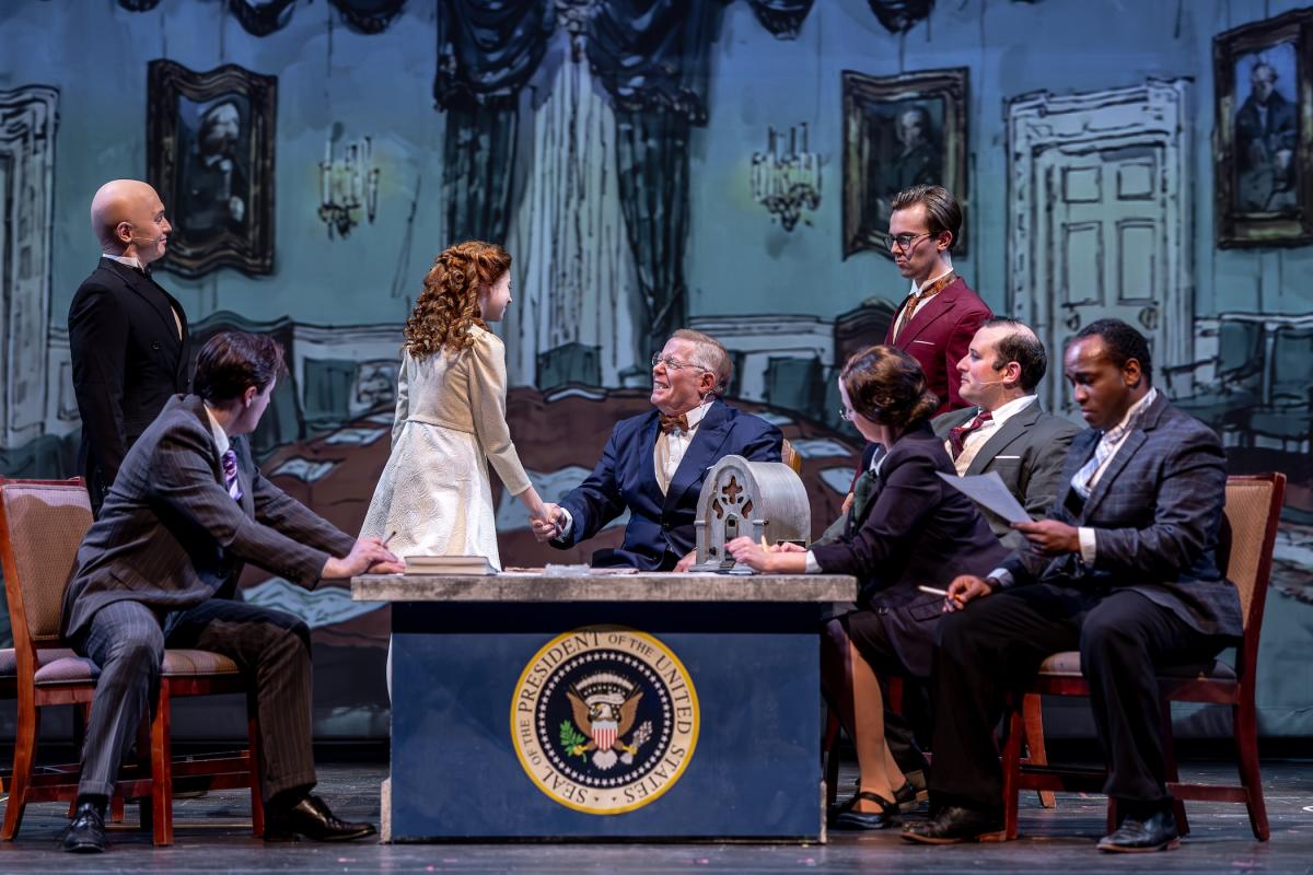 At the Warbucks mansion, the entire staff falls in love with Annie. At Grace’s urging, Oliver Warbucks (Michael Metcalf) takes Annie everywhere with him, even to the White House where she meets President Roosevelt (Bob Sanders).