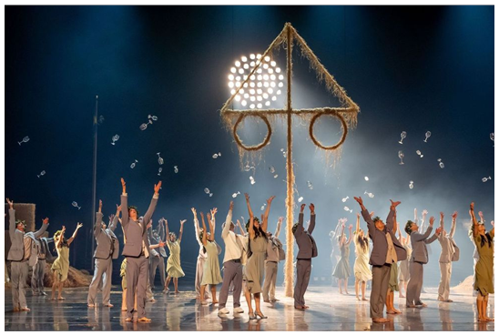 The festival opens with the entire company playing in hay. In synchronized movements, the kneeling dancers wave handfuls of hay, occasionally throwing it up in the air. The hay almost seems to fall in time to the music. I thought it was exceptionally beautiful.