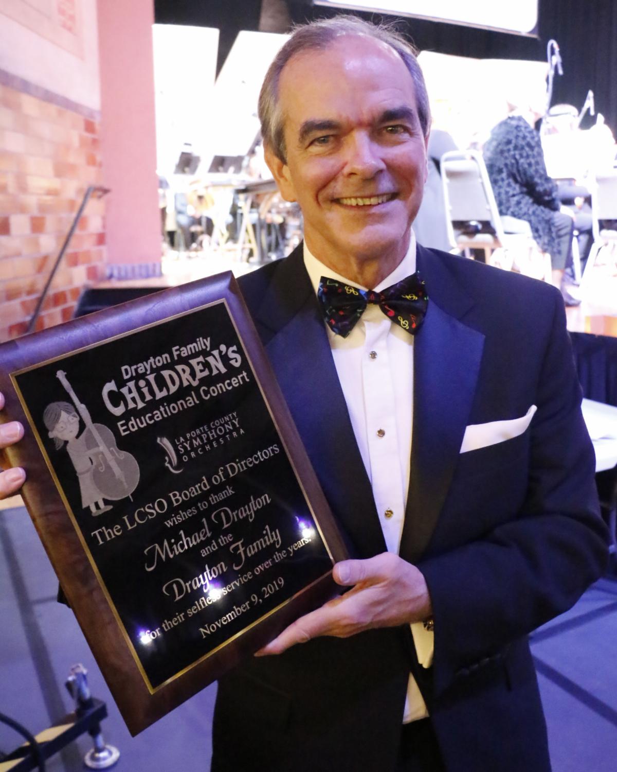 This recognition honors Drayton’s commitment to the Children’s Concerts he helped create 31 years ago. Since that time, the LCSO has conducted Children’s Concerts for students and educators in La Porte County as well as surrounding counties numbering anywhere from 5,000 to 8,000 in attendance. These concerts have been nationally recognized as one of the most successful children’s concerts in the nation by the American String Teachers Association and the National School Orchestra Association.