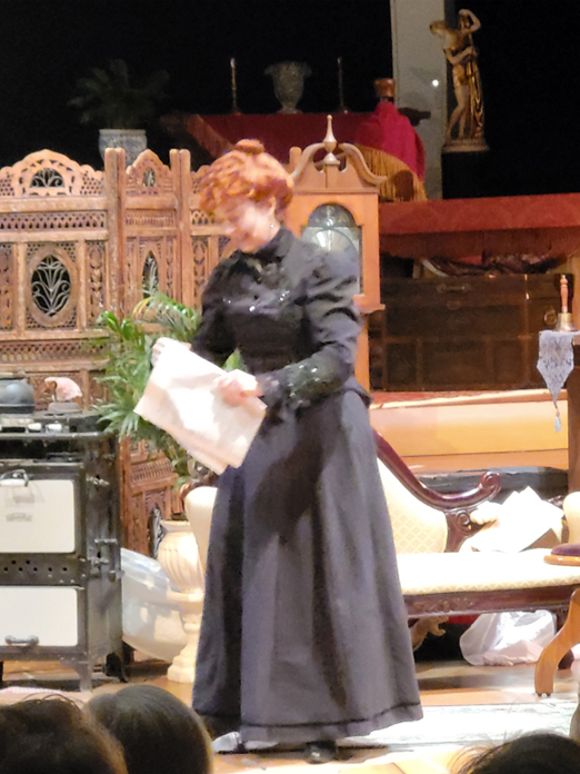 On that fateful day, she said, her sister was away visiting a friend. Her father had been in town on business but returned to take a nap. Her stepmother wasn’t feeling well so she was resting in her room. Lizzie was in the barn. When she came into the house, she found her father in the sitting room covered in blood. She was so upset, she ran to a neighbor’s for help. The neighbor – audience member Carolyn Jacobs – went upstairs with her and screamed a most excellent scream when she ‘saw’ the body.