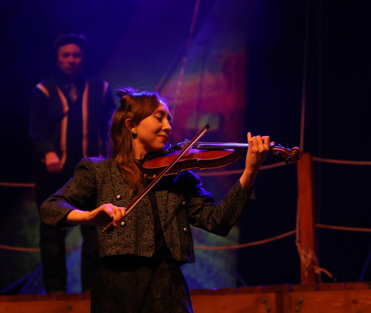 The delightful and talented cast included Michael Mahler (Man #1), Luke Nowakowski (Man #2), Leah Morrow (Woman #1) and Emily Goldberg (Woman #2). Musical accompaniment is provided by David Fiorello (Conductor/The Pianist), Elleon Dobias (The Violinist) and Mahler on guitar. By the way, the Irish would call Dobias a fiddler as she played foot-stomping rhythms.