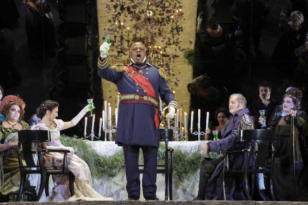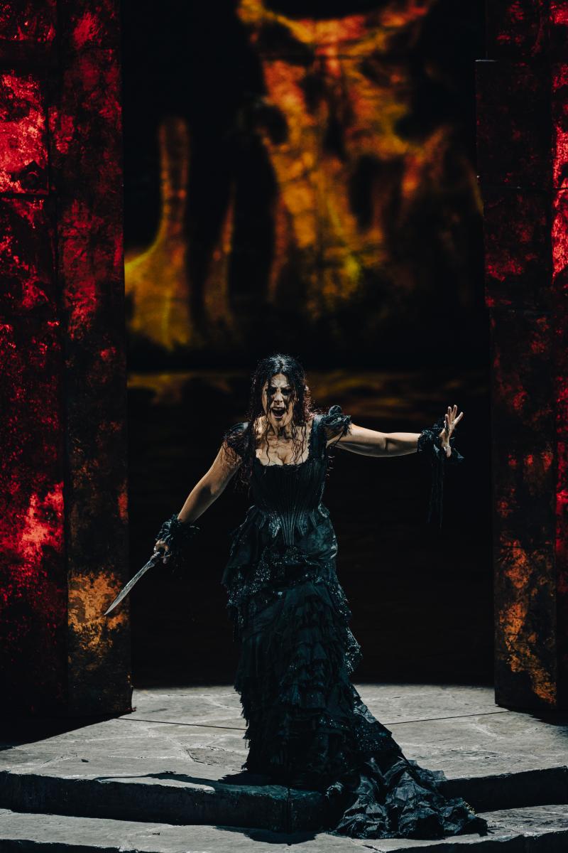 Sir David McVicar directed this production of "Medea" and it is much more similar to his "Electra" (Lyric season 2018/2019) than his excruciatingly dark (as in, poorly lit) "Macbeth," which opened their 2021/2022 season. His "Medea" has magically transformed from a classical Greek tragedy to a modern psychological drama of the highest order. McVicar also acted here as set designer, and perhaps no element of his set design which dominates Lyric's stage is more discussed than the giant mirror upstage. Installed at a 60 degree angle to the stage's floor, this wall of burnished metal with flecks of gilded tarnish offers an interesting perspective during the larger crowd scenes and processions which take place in the first two acts. However, by the opera's thrilling conclusion outside of the temple, the reflection of Medea with her two young sons on either side of her is the image that will be burned into most people's memory.