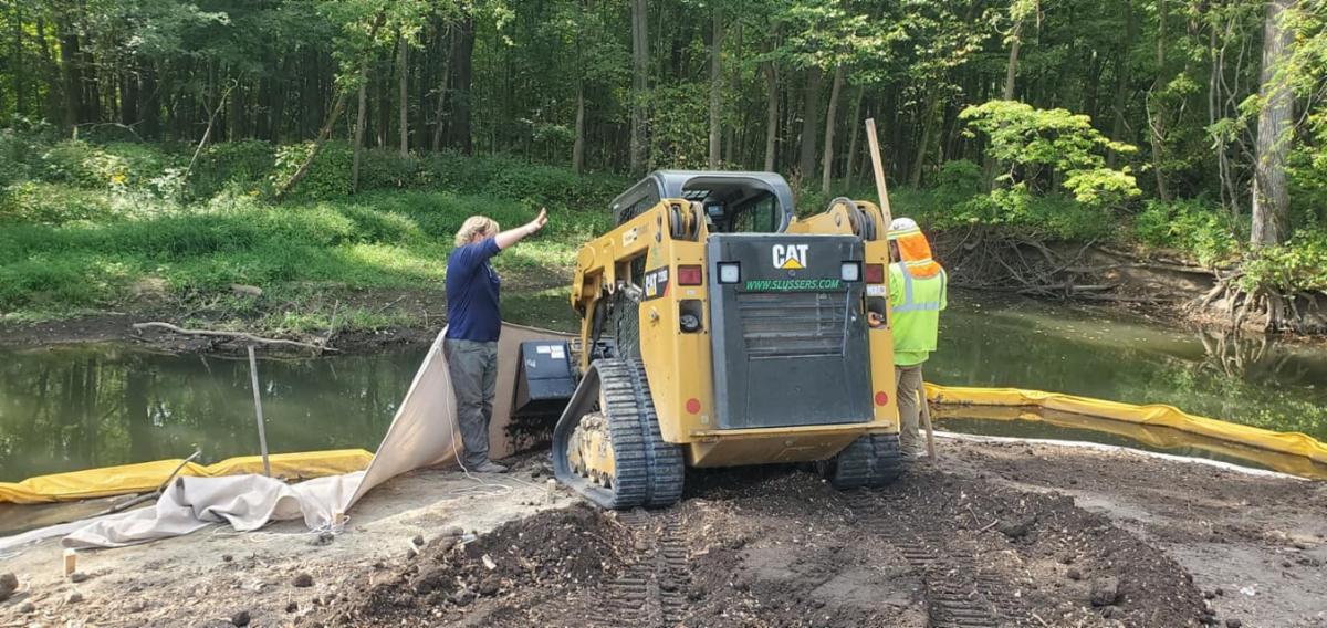 Severely eroded streambanks that were once a source of trash and sediment to the river are being regraded and stabilized to function as floodplain benches.