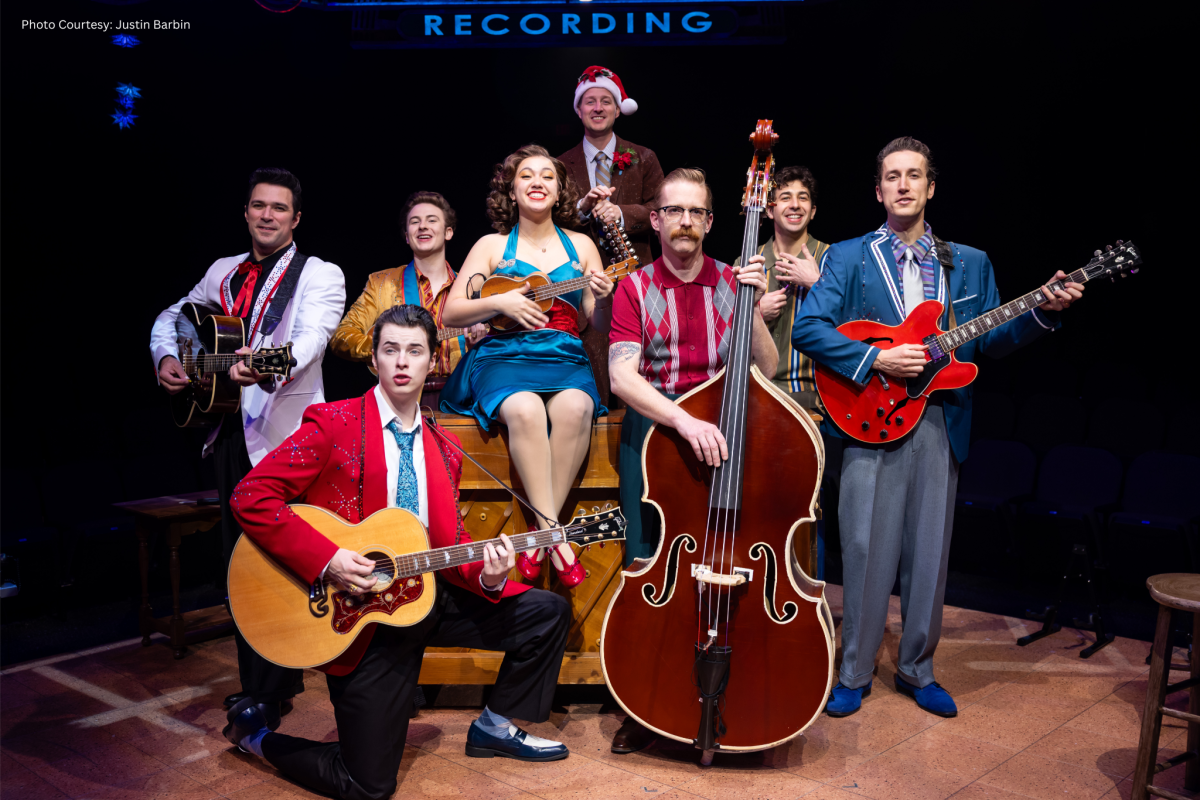 After a short pause, everyone returns to the stage wearing sequins, and suddenly, it’s a concert after the musical! Elvis sings I’ll Be Home for Christmas and Santa Claus is Coming to Town. Perched on top of the piano, Dyanne strums a ukelele and leads the company in Mele Kalikimaka. Johnny Cash lends his deep voice to God Rest Ye Merry Gentlemen. Jerry Lee Lewis does acrobatic moves on his piano as he plays and sings Jingle Bells. The finale – Carl Perkins rocks with Run, Rudolph, Run.
