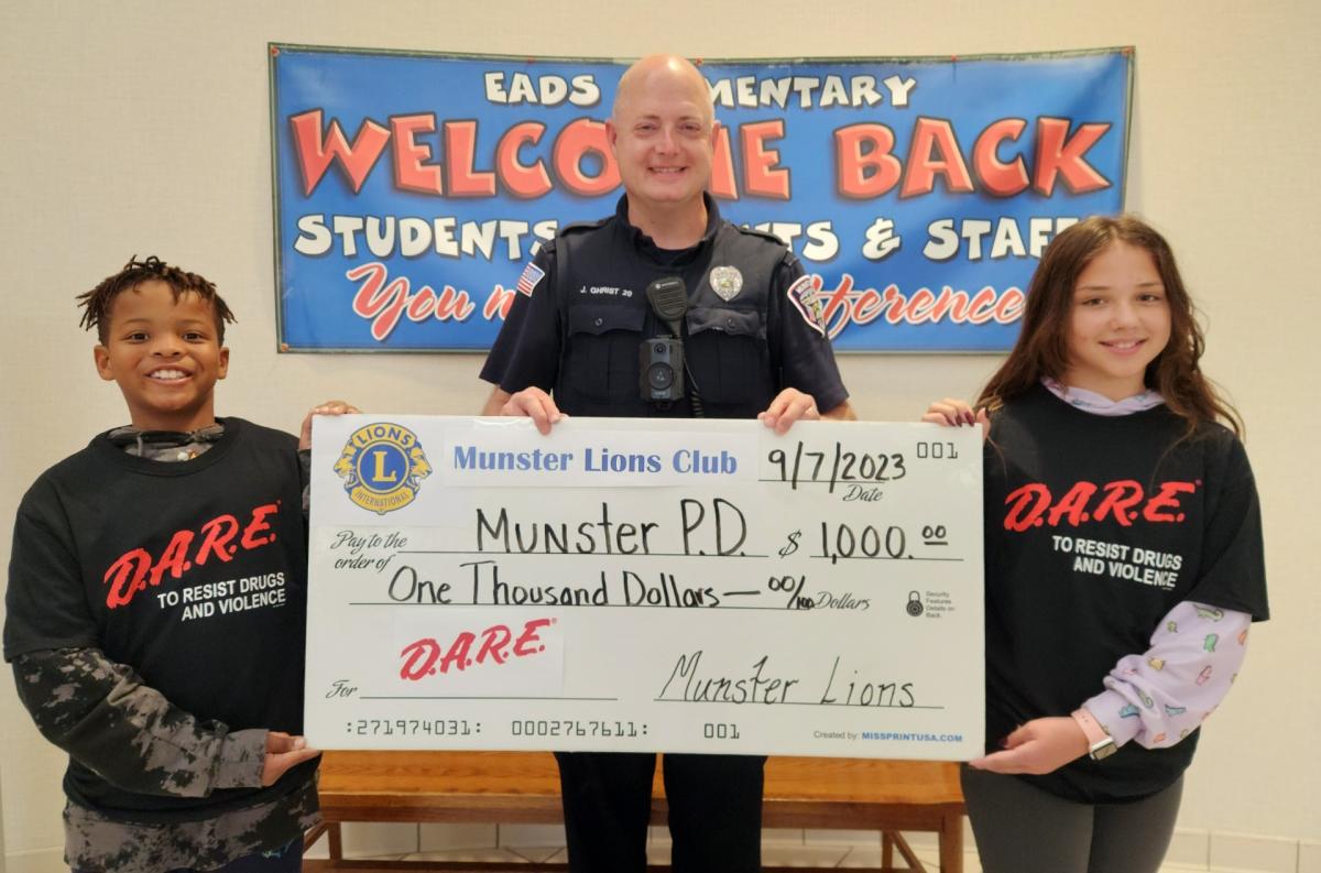 The Munster Lions Club recently provided a generous $1,000 donation towards the Munster Police Department’s Drug Abuse Resistance Education (DARE) Program.