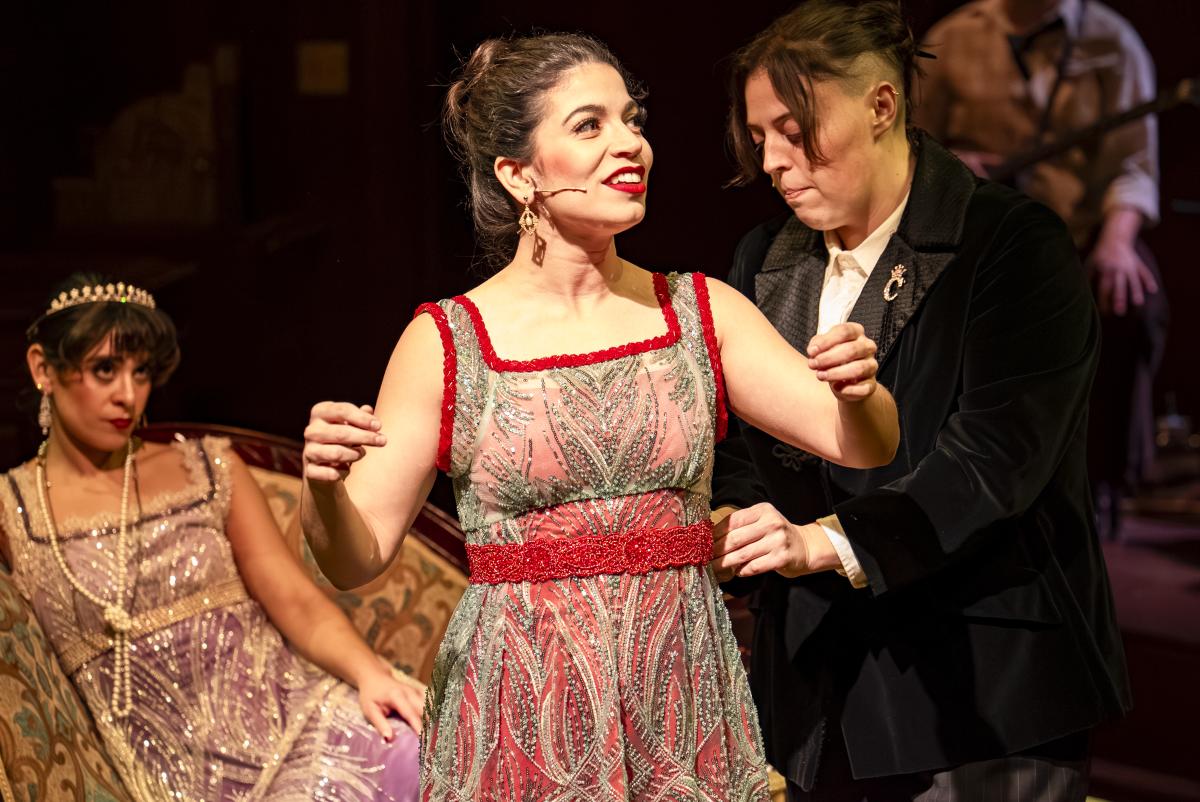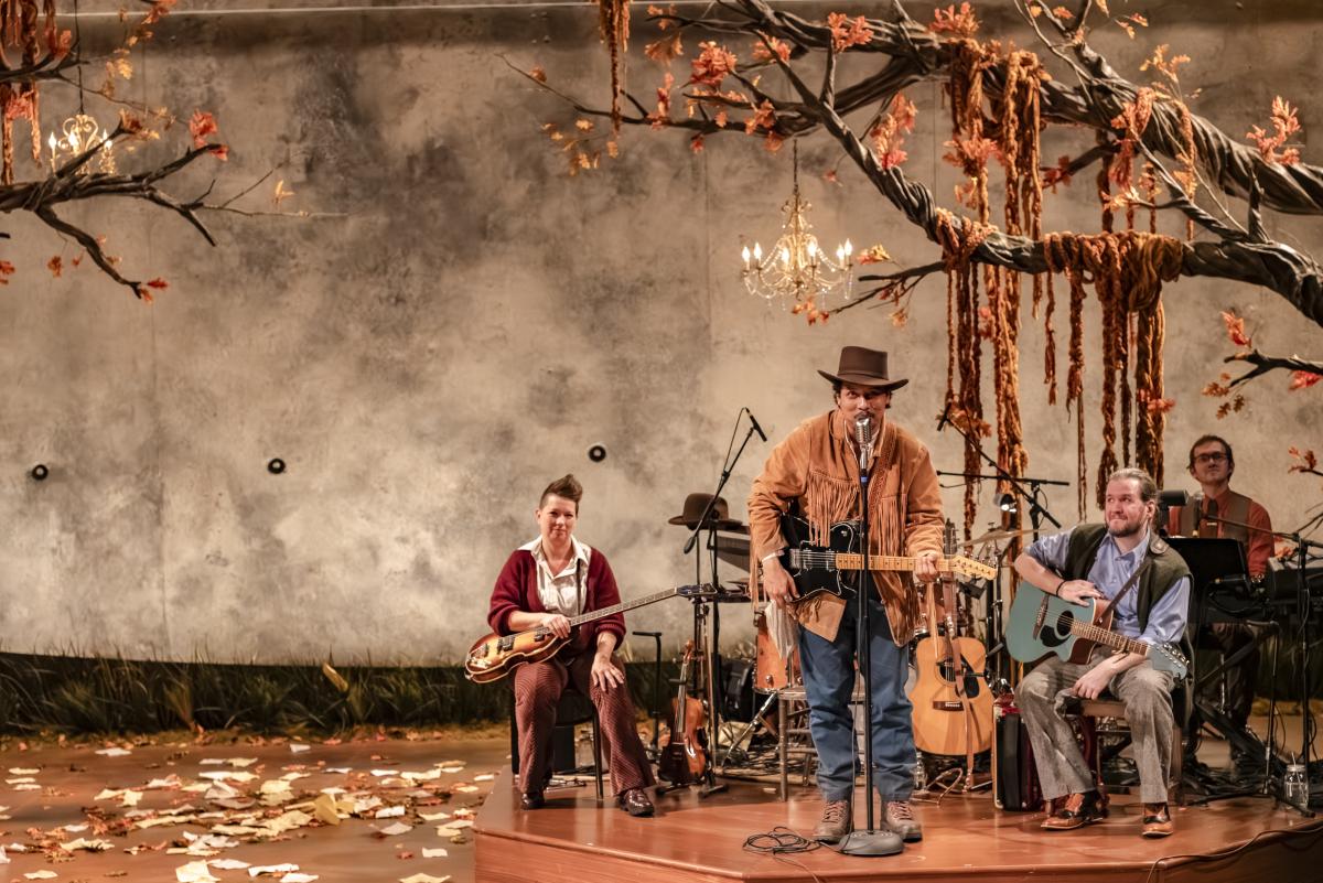 When you get there, don’t waste a lot of time in the lobby because the band is already playing some tunes. While they occupy a band stand, there’s a beautiful bar with shiny dark wood on the opposite side. The lead singer, Jacques (Matthew C. Yee), wearing a fringed buckskin jacket and wide-brimmed hat, strums his guitar as he sings the prologue.