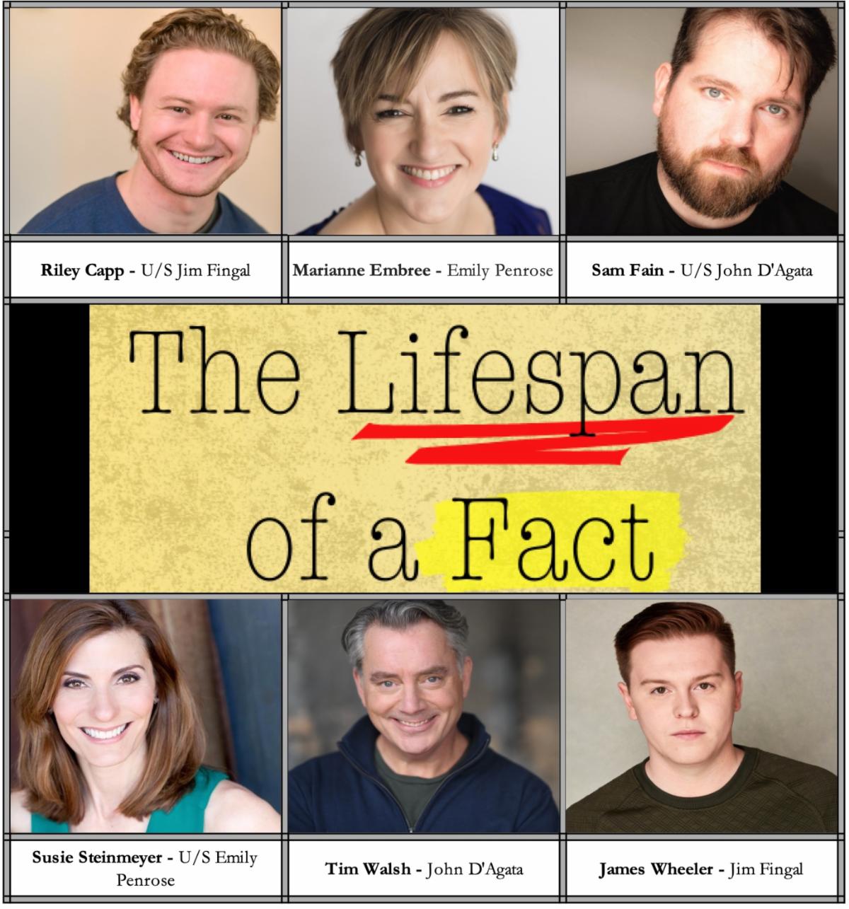 The cast of The Lifespan of a Fact includes Marianne Embree (she/her, Emily Penrose); Tim Walsh (he/him, John D’Agata); James Wheeler (he/him, Jim Fingal) and understudies Susie Steinmeyer (she/her, Emily Penrose U/S); Sam Fain (he/they, John D’Agata U/S) and Riley Capp (he/him, Jim Fingal U/S).