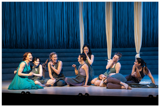 The Maids – Aja Alcazar, Demetra Dee, Maya Lou Hlava, Noelle Kayser, Elizabeth Laidlaw, Helen Joo Lee, Tyler Meredith, Ericka Ratcliff, Andrea San Miguel, Laura Savage, Allison Sill and Hannah Whitley – are phenominal! In addition to their duties as maids, they play Penelope’s family, Odysseus and his family, the nurse, and the suitors. They sang, they danced, they fought, they filled the stage.