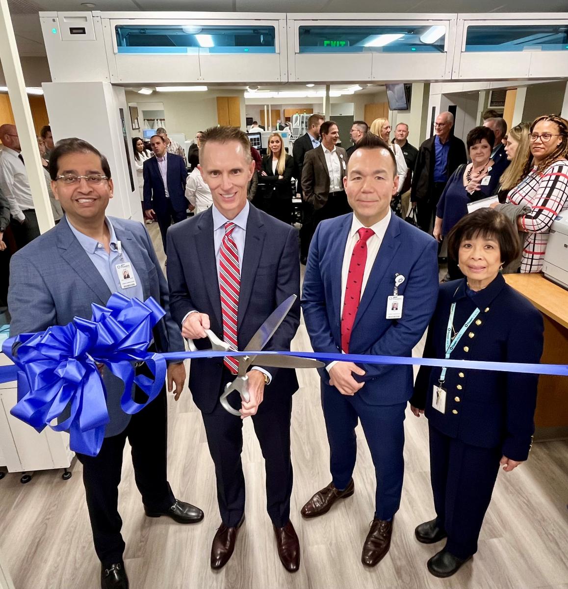 Powers Health CEO Donald P. Fesko, second from left, cuts a ribbon to celebrate the implementation of Roche Diagnostics’ Total Solution in the Community Hospital Laboratory. Also on hand for the celebration are, from left, Powers Health Chief Operating Officer Alan Kumar, MD; Community Hospital CEO Randy Neiswonger; and Elizabeth Yee, vice president of Clinical Ancillary Services for Powers Health.