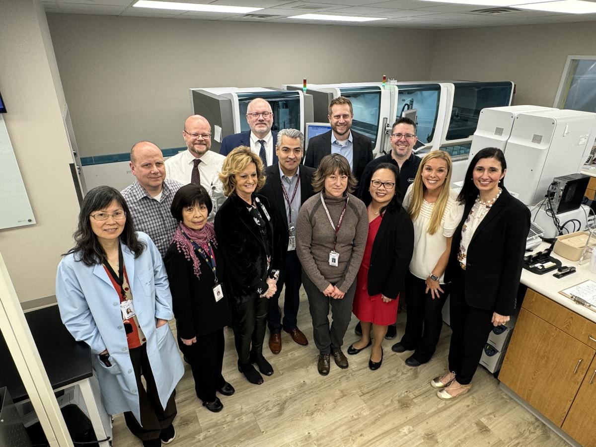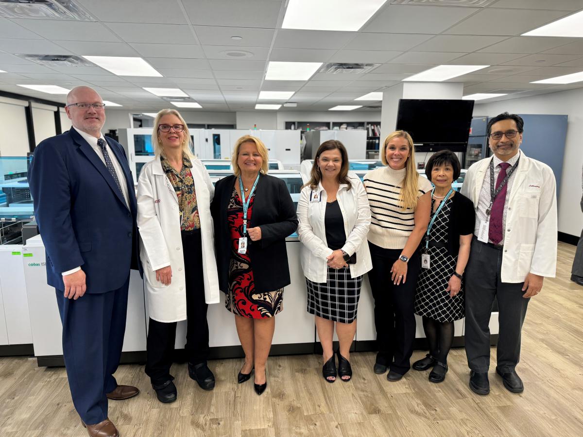 St. Catherine Hospital and Roche Diagnostics leaders, including St. Catherine Hospital CEO Leo Correa, center, stand in front of the new conveyor-system testing equipment in the St. Catherine Hospital Laboratory.