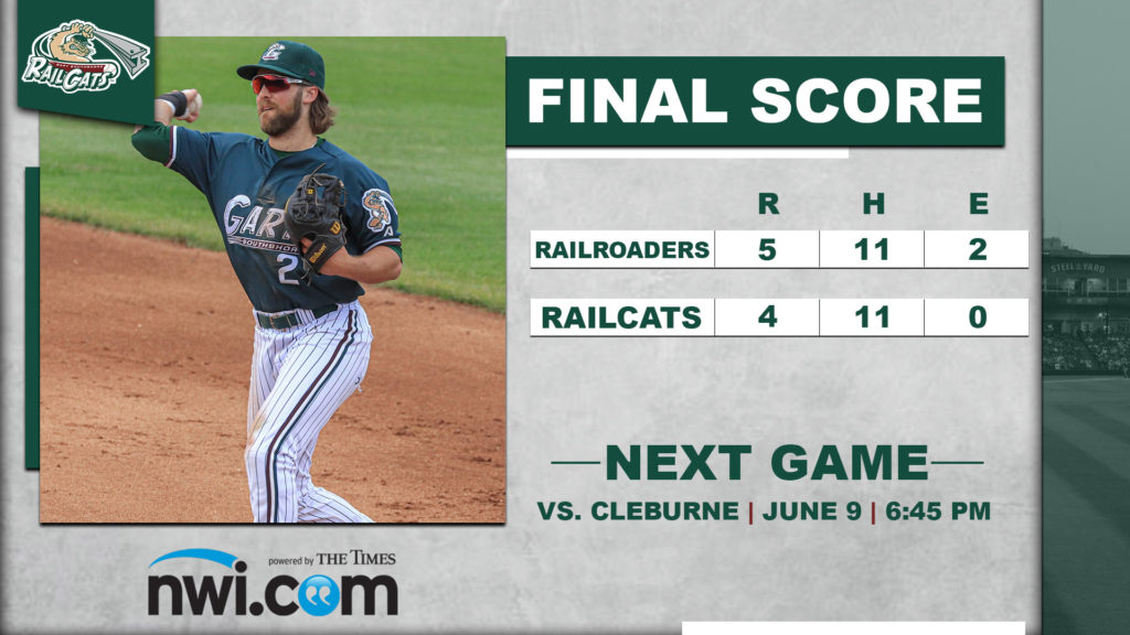 The Gary SouthShore RailCats (12-14) had the tying run on third base in the bottom of the ninth, but a late comeback effort fell just short in a 5-4 loss to the Cleburne Railroaders (13-13) on Thursday night.