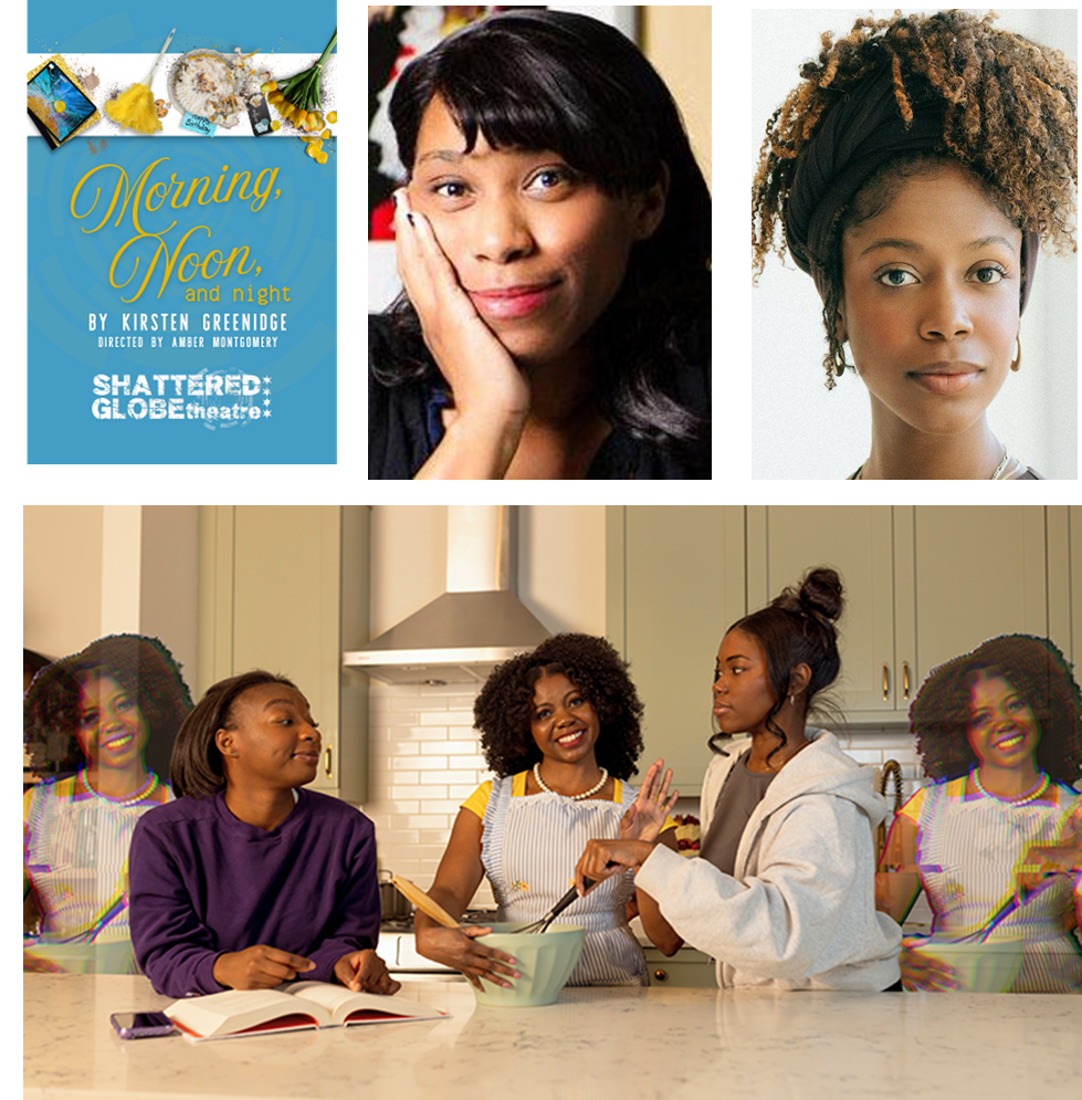 Morning, Noon, and Night by Kirsten Greenidge (top, center), directed by SGT Associate Artistic Director AmBer Montgomery (top, right), features (from left) Leslie Ann Sheppard as Miss Candice, Emefa Dzodzomenyo as daughter Dailyn, Leslie Ann Sheppard again as Miss Candice, Kristin E. Ellis as Dailyn’s mom, Mia, and Leslie Ann Sheppard yet again as Miss Candice. Credit: Abboye Lawrence
