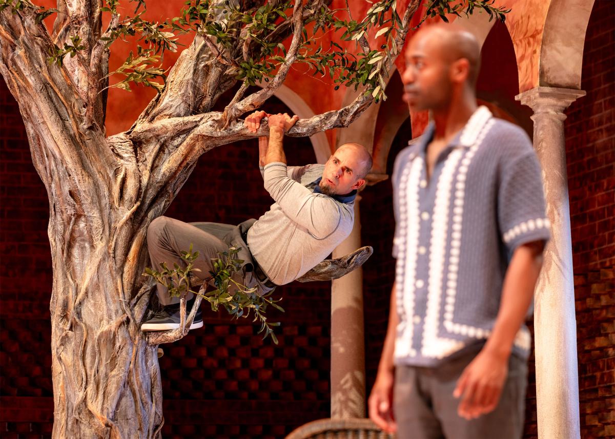 Bored, Don Pedro and Claudio decide to prank Benedick. When they catch sight of him, they start a conversation speculating about Leonardo’s daughter Beatrice who they think is in love with Benedick. Marc Bedard gets a chance to show off his comedic talent in this scene as he ‘hides’ behind a tree, up in the tree, behind a chair, even in the audience.