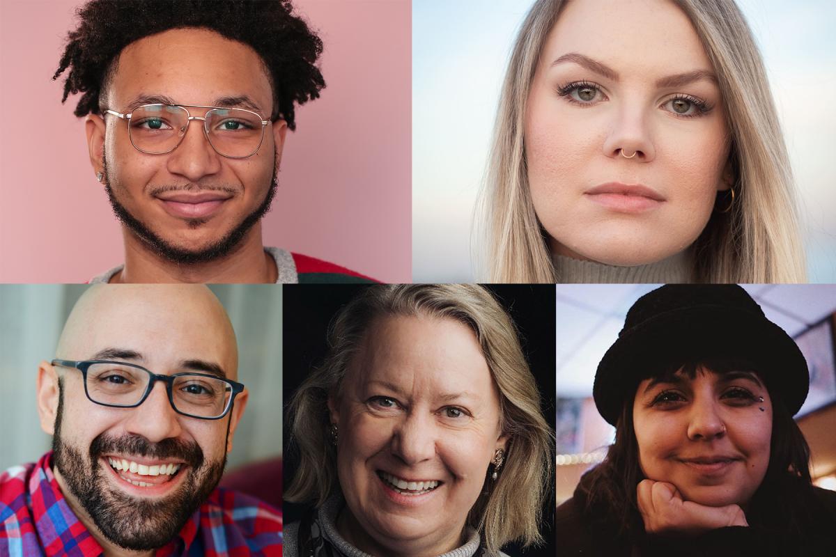 Refracted Theatre Co.’s 2022 RefrAction Lab cohort includes (top, l to r) Adonis Holmes and Alica Daine Benning, (bottom, l to r) Ryan Oliveira, Amy Crider and maiya a. corral.