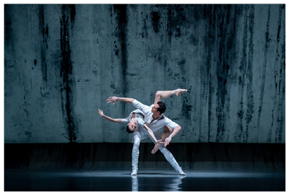 Using tiny yet expressive movements as well as broad leaps, the ensemble executes Scarlett’s choreography with finesse. Light gray costumes play well against John McFarlane’s backdrop, black spatter paint on white, fluttering above a ramp which the dancers use to slide onto the stage. In contrast, the featured couples are wearing dark gray.