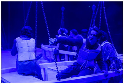 Kudos to Scenic Designer Collette Pollard who conveyed the idea of a ship without actually building one. There were a couple of short smokestacks (that doubled as tables with the addition of a tablecloth), rigging ropes, a railing with two skeletons of life boats suspended above. Four large video boards specified location, i.e. bridge, first class dining room, 3rd class deck, etc.