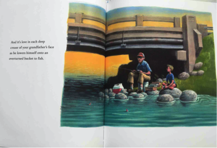 To address those goals, Chicago Children’s Theatre is using children’s author Matt de La Peña’s new book “Love” as source material for exercises they are creating with Lurie. One exercise, called “Fishing for Memories,” is based on an illustration of a grandfather and grandson fishing. The class is shown the illustration, then kids are asked to “draw or paint a memory of a time or place when you were happy.”