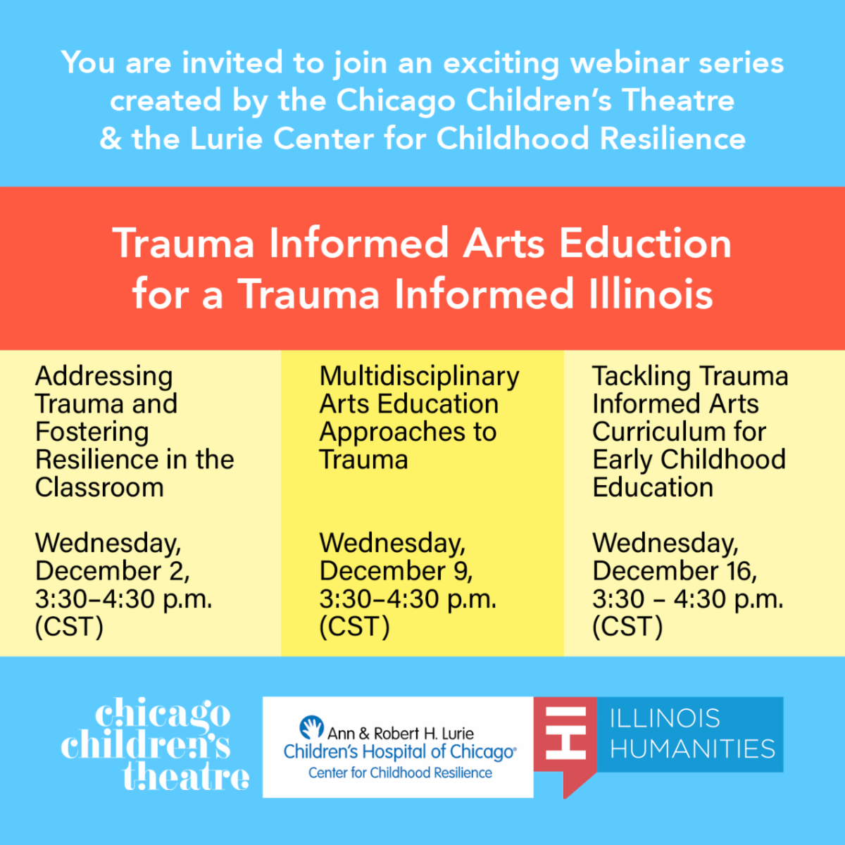 On three consecutive Wednesdays in December, Chicago Children’s Theatre and The Lurie Center for Childhood Resilience are encouraging artists who work or specialize in TYA (theater for young audiences), early childhood educators and youth mental health experts to join in a series of live, virtual webinars to discuss, share and learn how to identify children impacted by trauma, and how to use theater and other art forms to address their emotional and learning needs while fostering resilience.