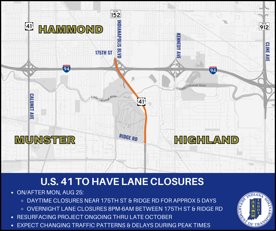 Indiana Department of Transportation contractor Rieth-Riley Construction will have lane closures on U.S. 41/State Road 152/Indianapolis Blvd between 175th St and Ridge Rd beginning on or after Monday, August 25 for a road resurfacing project.