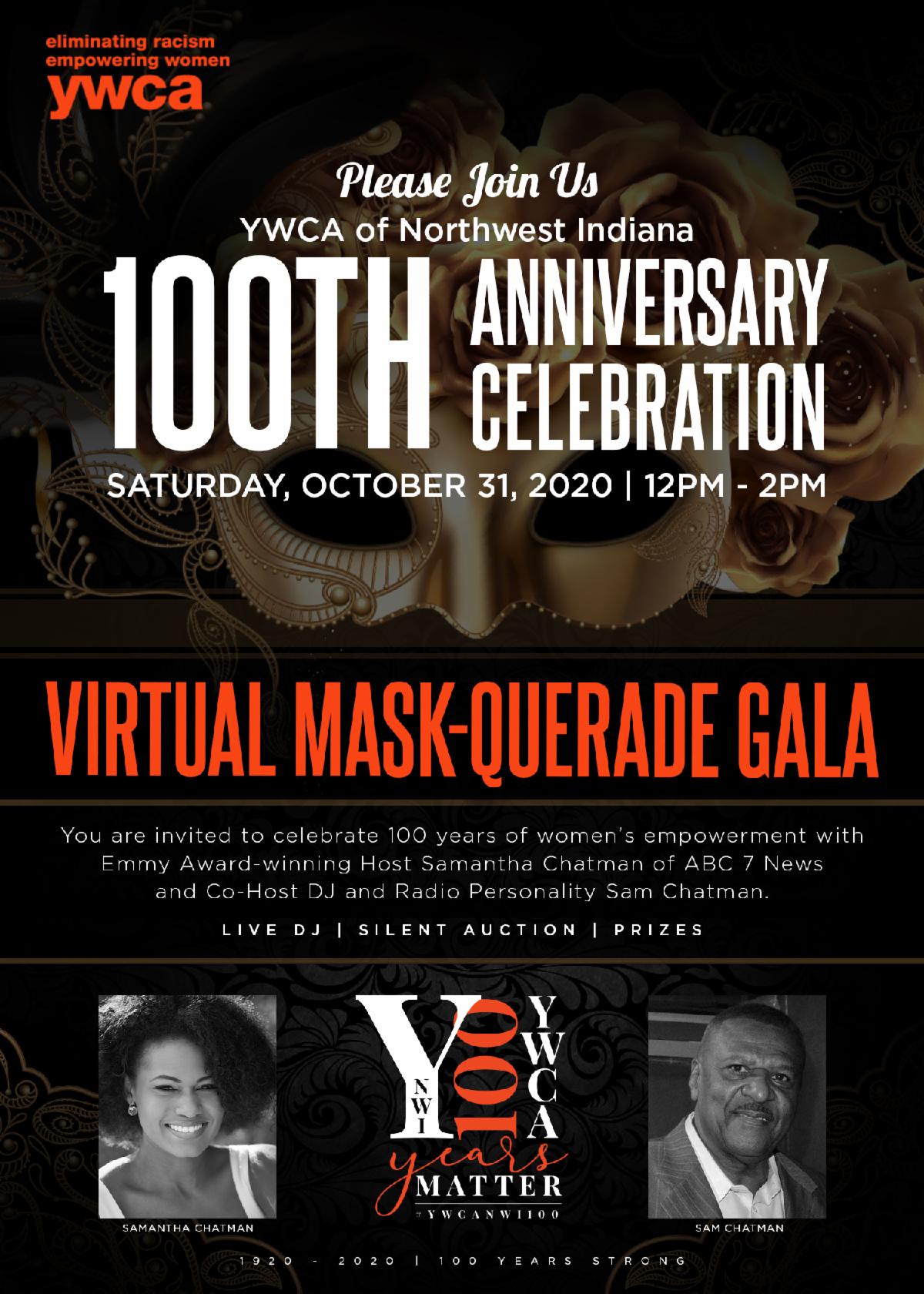 The YWCA of NWI is celebrating its 100th Anniversary with a virtual Mask-Querade Gala on Saturday, October 31st from 12:00 p.m. – 2:00 p.m. There is no cost to attend the online celebration, but donations are encouraged. A goal of $100,000 has been set, and funds will be used for building improvements and programming support.